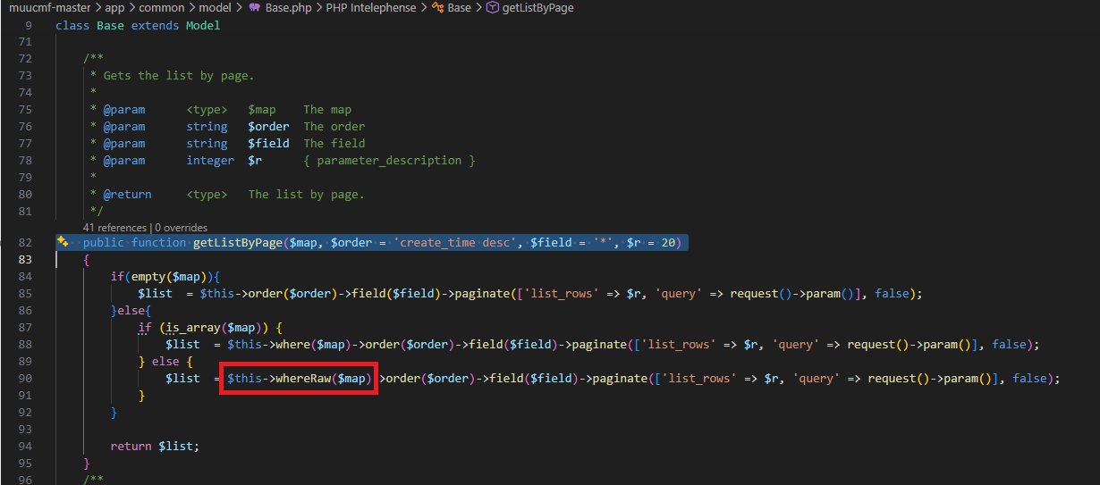 Let deep dive into the logic of getListByPage(). First it will check is $map empty, if the $map is empty, it will use $order and $field. If $map is an array, it will use the Query Builder, and it prevent SQL Injection very well. And if $map is not an array, it will use the whereRaw - it let us to inject raw query. Coolllllll.