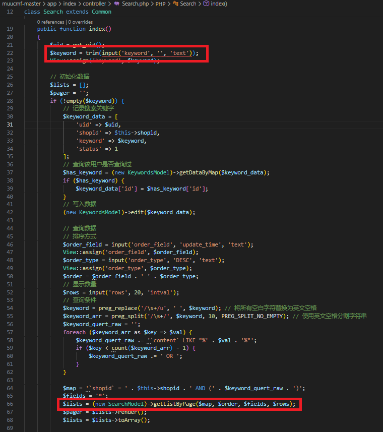 Now we know that the getListByPage() is the dangerous sink, we need to find out the source where let user enter data. After search in the project, I found that in a muucmf-master\app\index\controller\Search.php, a search controller let user search the for the keyword and it use getListByPage().