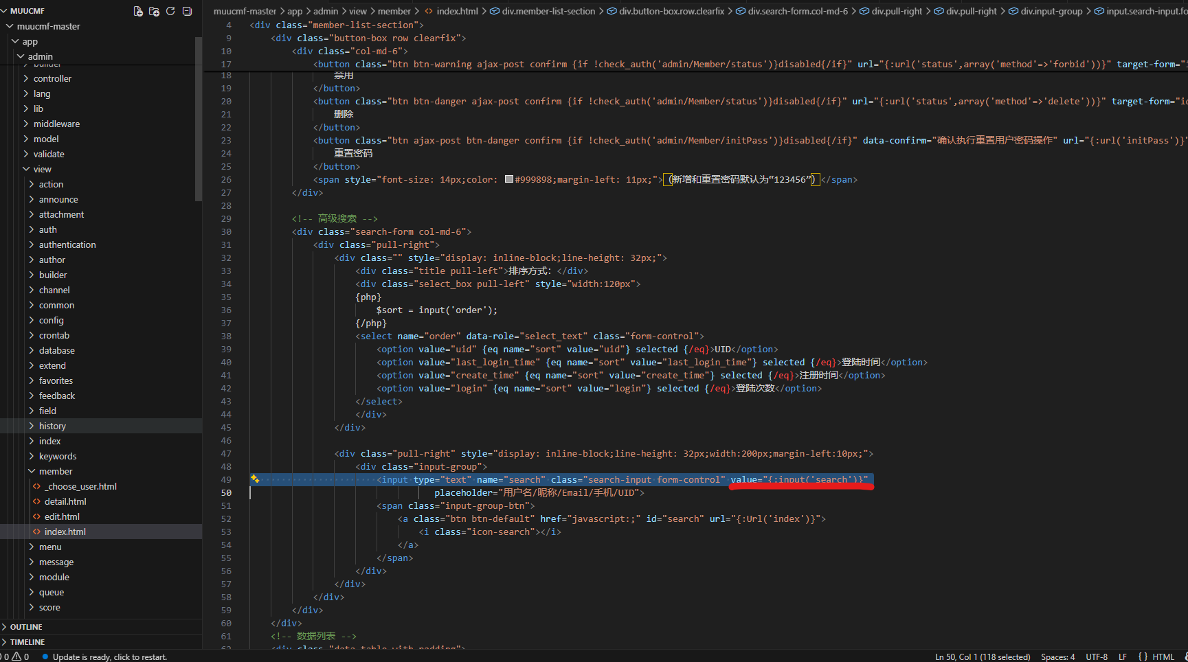In the muucmf-master\app\admin\view\member\index.html file, line 49 the value of input tag is using input from user without filter or santitize and the data is reflected in website leak to XSS vulnerability.